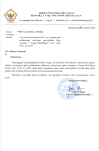 Presisinews24.Com – Palembang, BPK RI Perwakilan Propinsi Sumatera Selatan tindaklanjuti Laporan Pengaduan Nomor 095/LT/Masyarakat Independent-Germasi/PP.43-2018/XI/2024 tentang Dugaan Indikasi Perbuatan Curang & Pembiaran Perbuatan Curang Pada Pelaksanaan Pekerjaan Peningkatan Jalan Simpang 4 Sungai Ibul – Babat ( DAU ) Di Satuan Kerja Dinas PUPR Kabupaten Pali Propinsi Sumatera Selatan Tahun Anggaran 2024.