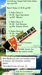 PRESISINEWS24.COM,Way Kanan – Beredar pesan WhatsApp di beberapa group WhatsApp yang menyebutkan bahwa beberapa Aparatur Kampung kW , atau Palsu dimana dimaksud sebagai penerima SK tidak sesuai dengan kegiatan di lapangan, dengan kata lain orang yang bertindak sebagai Kepala Dusun berbeda dengan nama SK yang tercantum, Selasa (02/09/2025).