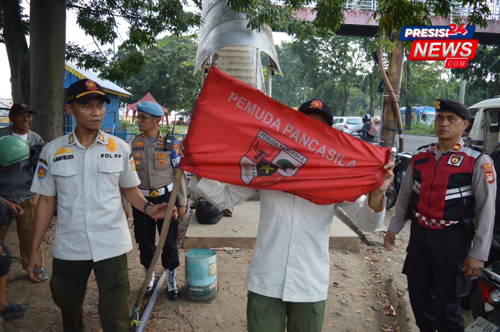 Penurunan atribut ormas dilakukan di beberapa titik, termasuk di sekitar traffic light (TL) Terbus Kalideres dan depan jembatan HIPLi. Total 23 personel gabungan yang terdiri dari TNI, Polri, dan Satpol PP dikerahkan dalam operasi tersebut.