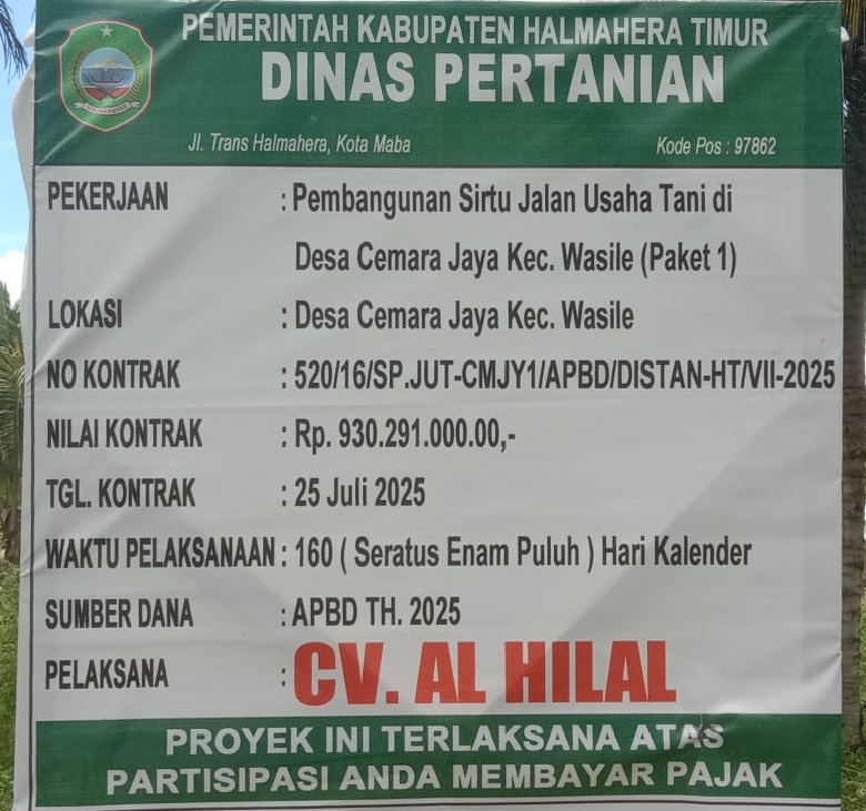 PRESISIBEWS24.COM ~ Sadis pekerjaan yang bersumber dari Anggaran Negara (ABPD THN 2025) yang ada di wilayah Halmahera timur dengan jenis pekerjaan pembangunan jalan sirtu jalan usaha tani di Desa Cemara jaya kecamatan wasile dengan nomor kontrak 520/16/SP,JUT -CMJY1/ABPD/DISTAN-HT/Vll-2025