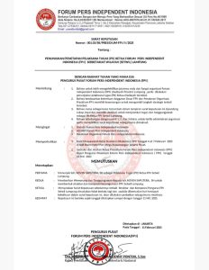 LAMPUNG,presisinews24.com, – Hasil dari Mukernas fpii ke-9 di Jakarta pada tanggal 04 Februari 2025 adalah salah satunya memutuskan untuk di tempatkannya wakil Ketua prisedium forum pers independent Indonesian (FPII) yang di tugaskan menjabat sebagai PLT Ketua Sekretariat Wilayah Provinsi Lampung hingga batas waktu yang belum di tentukan.